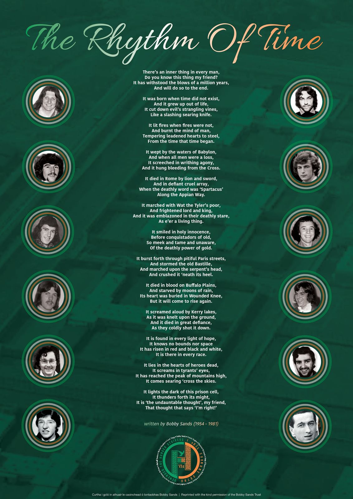 An A3 poster which includes images of the 12 men who died on Hunger Strike in the current phase of struggle, alongside the poem "Rhythm of Time" which was written by IRA hunger striker Bobby Sands before his death in prison